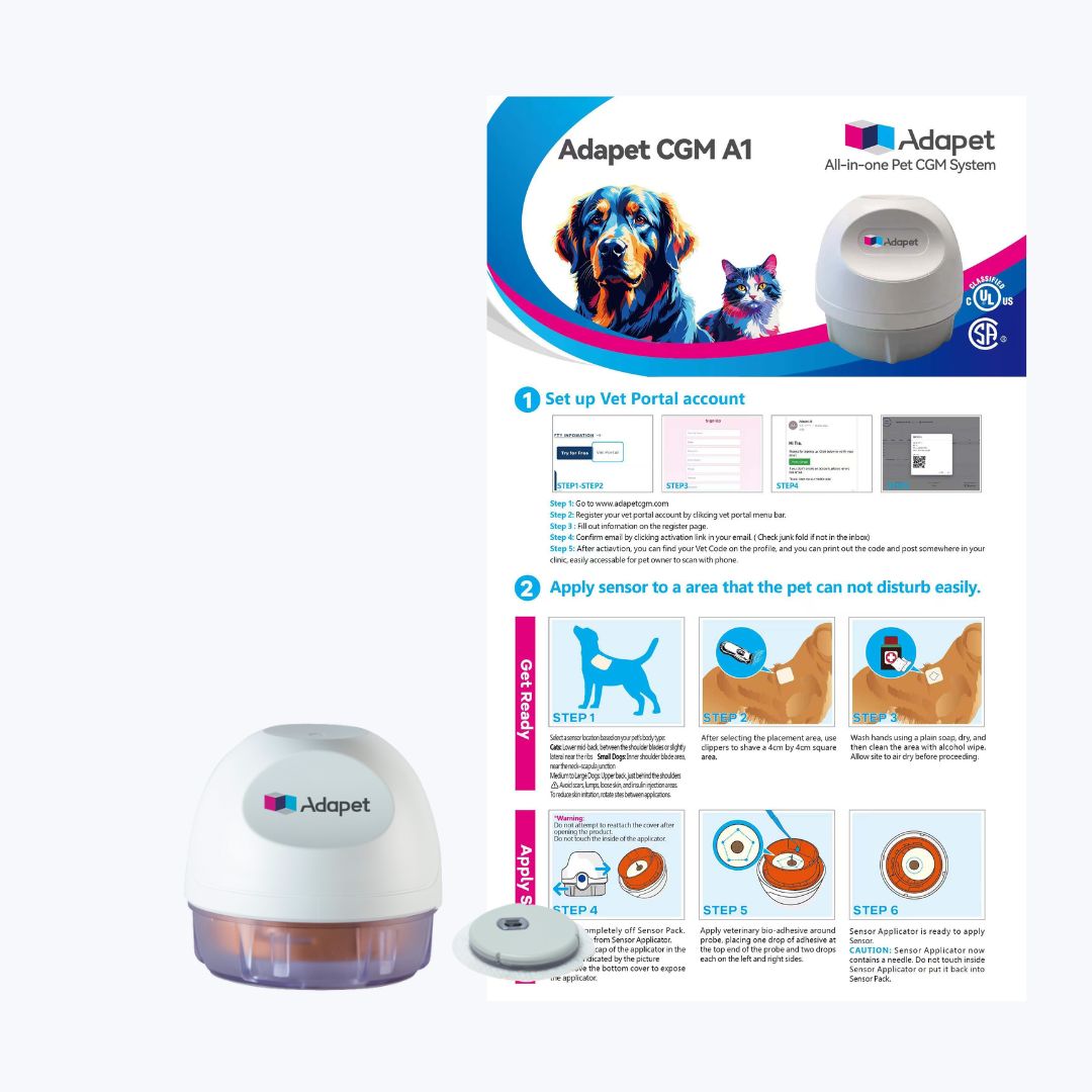 Adapet Pet CGM A1 is a Continuous Glucose Monitoring (CGM) device designed for diabetic dogs and cats. It provides up to 9 days of real-time glucose data, helping pet owners and veterinarians monitor and manage diabetes more effectively without frequent blood sampling.